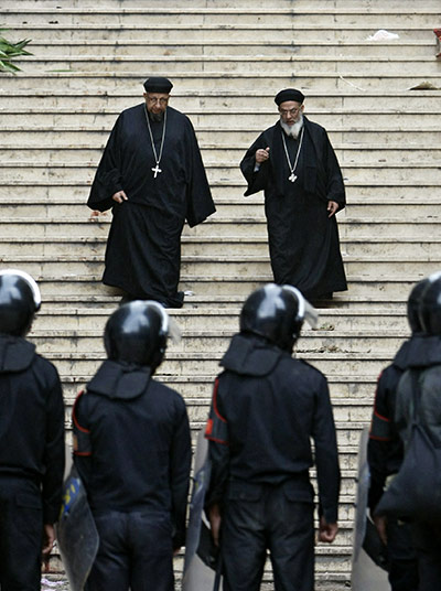 Riot police stand guard as Coptic priests walk down steps outside the al-Qidiseen church