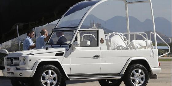 El papamóvil de Francisco, un Mercedes-Benz Clase G, llegó sin los vidrios a prueba de balas. El Sumo Pontífice ya había avisado a las autoridades brasileñas que no deseaba utilizar el papamóvil blindado para trasladarse en Río, sino el jeep descapotado que usa en la Plaza San Pedro, de Roma.