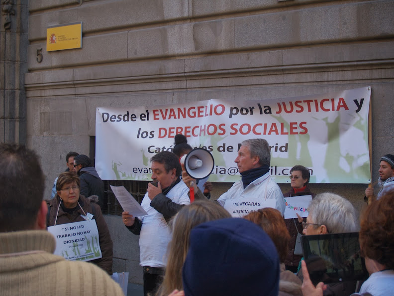 (José L. Palacios, Hoac).- El pasado 1 de diciembre frente al número 5 de la calle Alcalá, sede del ministerio de Hacienda, se reunió un nutrido grupo de personas, en una manifestación más, al calor de la indignación que recorre la sociedad, pero con un pequeño matiz que la hacía diferente... Eran curas, religiosas y religiosos, familias, personas solas, en activo, jubiladas o en desempleo..., todos unidos por la fe en Jesucristo, dispuestos a denunciar los estragos que causan las actuales políticas en los más desamparados de la sociedad y solidarizarse con ellos. Los convocantes habían sido más de 40 entidades católicas de Madrid entre parroquias, movimientos, comunidades, congregaciones y colectivos diversos.